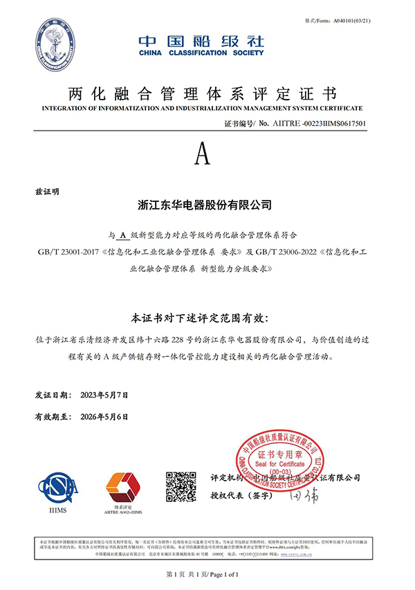 公司始終堅(jiān)持以“創(chuàng)行業(yè)品牌,造專業(yè)品質(zhì),展員工所長(zhǎng),為顧客所想,遵章守法、預(yù)防為主、持續(xù)改進(jìn)、健康安全”的管理方針和“為顧客創(chuàng)造價(jià)值;為企業(yè)謀求發(fā)展;為社會(huì)承擔(dān)責(zé)任”的經(jīng)營(yíng)理念來指導(dǎo)公司的經(jīng)營(yíng)生產(chǎn);公司分別通過了ISO9001質(zhì)量體系認(rèn)證、ISO14001環(huán)境體系認(rèn)證、ISO45001職業(yè)健康安全管理體系認(rèn)證和兩化融合體系認(rèn)證,生產(chǎn)產(chǎn)品擁有UL、CB、TUV、CE、CSA、KC、ERP、CQC認(rèn)證和強(qiáng)制性產(chǎn)品認(rèn)證自我聲明等認(rèn)證及計(jì)量生產(chǎn)許可證,并符合ROHS生產(chǎn)管理要求及擁有出口自營(yíng)權(quán)。東華電器作為專業(yè)制造的品牌產(chǎn)品銷售全國各地和亞、非、歐、美及東南亞等多個(gè)國家,深受用戶好評(píng),連續(xù)多年被政府部門及上級(jí)主管部門評(píng)為《國家高新技術(shù)企業(yè)》、《浙江省科技型中小企業(yè)》、《先進(jìn)企業(yè)》、《優(yōu)秀企業(yè)》、《中國鄉(xiāng)鎮(zhèn)明星企業(yè)》、《浙江省新千年質(zhì)量計(jì)量信得過企業(yè)》并連續(xù)二十五年被省金融部門評(píng)為《AAA級(jí)信用企業(yè)》等榮譽(yù)稱號(hào),已成為大中型企業(yè)、主要工程和國家電網(wǎng)的重要配套產(chǎn)品,公司遍布國內(nèi)外的經(jīng)銷商,將隨時(shí)為您提供專業(yè)的技術(shù)支持和迅捷的售后服務(wù),并成為您值得信賴的合作伙伴。